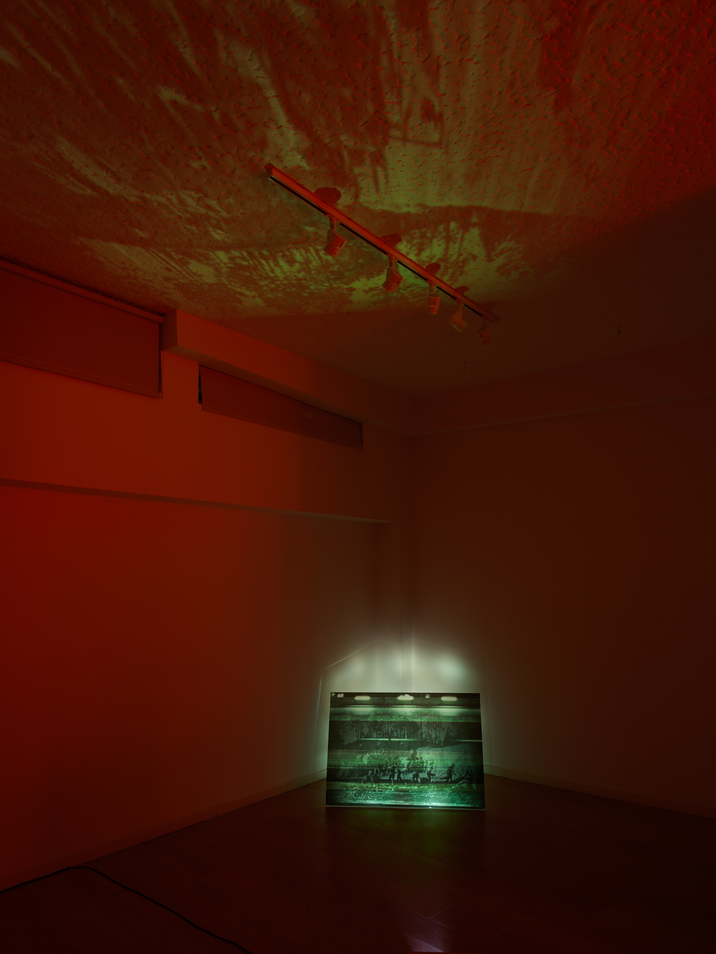 A entrada encontra-se iluminada por tons de laranja, o fogo ocupa todos os lugares. Um espaço assumidamente flamejante de onde surgem, por entre o magma, fotografias das minas encontradas nas mesmas. A representação que as ocupa, o processo mineiro, surge igualmente evidenciado nelas mesmas, nos seus rastros deixados pelo tempo, na sua decomposição, onde a sua dimensão concreta – esta fotografia - torna-se parte da fotografia em si e, deste modo, torna-se igualmente visível a sua dimensão processual. A fotografia deteriora-se porque inclui uma transformação material; esta transformação material inclui uma transformação laboral (e mineira). [+]