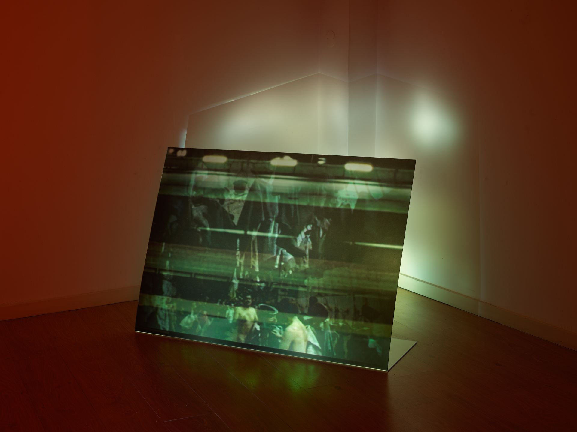 The montage projected onto acrylic is based on images from the publication O Pejão, which was produced by the Empresa Carbonífera do Douro (ECD) in the 1950s and 1960s; excerpts from the documentary, filmed on betacam, developed in the 1990s by the company, which exposes the different activities involved in coal mining; contemporary footage taken around the mining complex and excerpts from films such as Beau Travail (1999) by Claire Denis and The Working Class Goes to Heaven (1971) by Elio Petri. As for the sound, in addition to the audio from the films mentioned and direct sound, an audio recording of the testimony of former miner Manuel Rosas and a female voice recording of the Hymn of Santa Bárbara, Patron Saint of Miners, were used. On the acrylic, the still that accompanies Chantal Akerman's film D'Est (1993), which recalls a stratified soil, was printed.